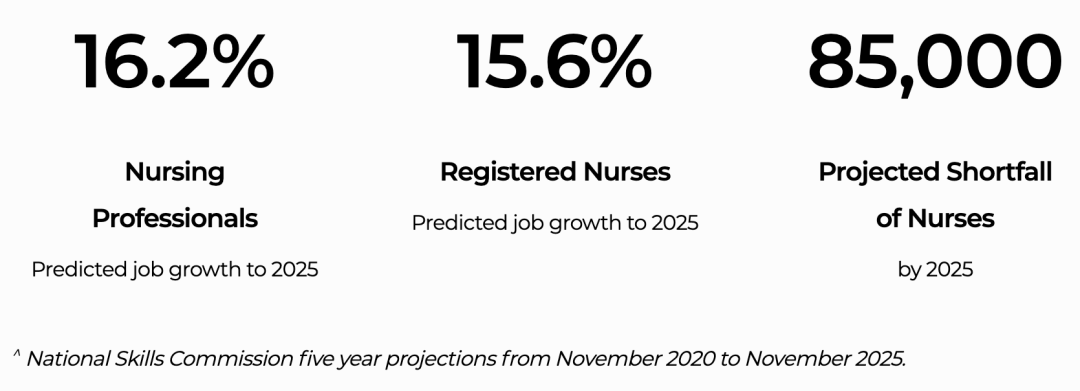 护理从业者是确保国家保健系统正常高效运行的关键因素。根据澳大利亚国家技能委员会的预测,从2020年11月至2025年11月的五年,澳大利亚的护理相关工作机会将增加 16.2%,护理从业人员的岗位预计新增 85,000个。