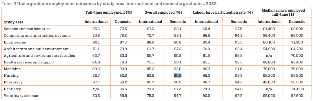 据澳洲教育部的QILT毕业生成果调查统计,2022年护理专业的本科生 90.9%在毕业后顺利找到了工作,证明了护理专业的人才紧缺。