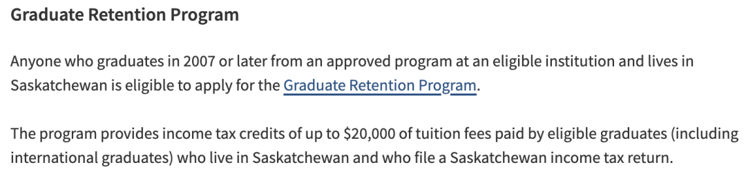 为保留人才,萨省专门设立了毕业生保留计划,通过提供高达 20,000加币的退税回扣,来奖励居住在萨省的毕业生。