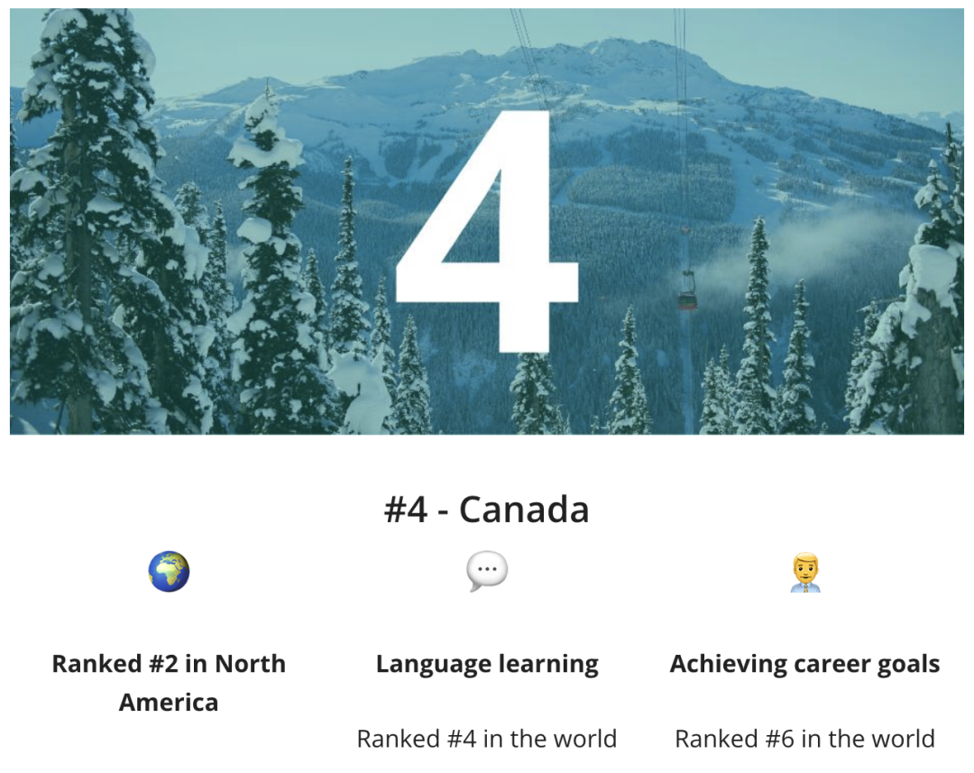 加拿大本地人大多都会说英语,但有五分之一人口的母语是法语,因此加拿大也是个学习两种语言的好地方。在“语言学习”指标中,加拿大获评全球第四。对于想学习外语的同学,加拿大也提供了很好的语言环境。
